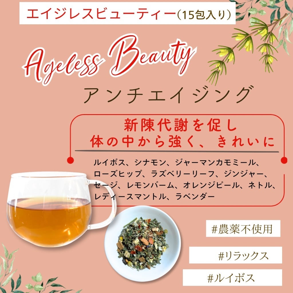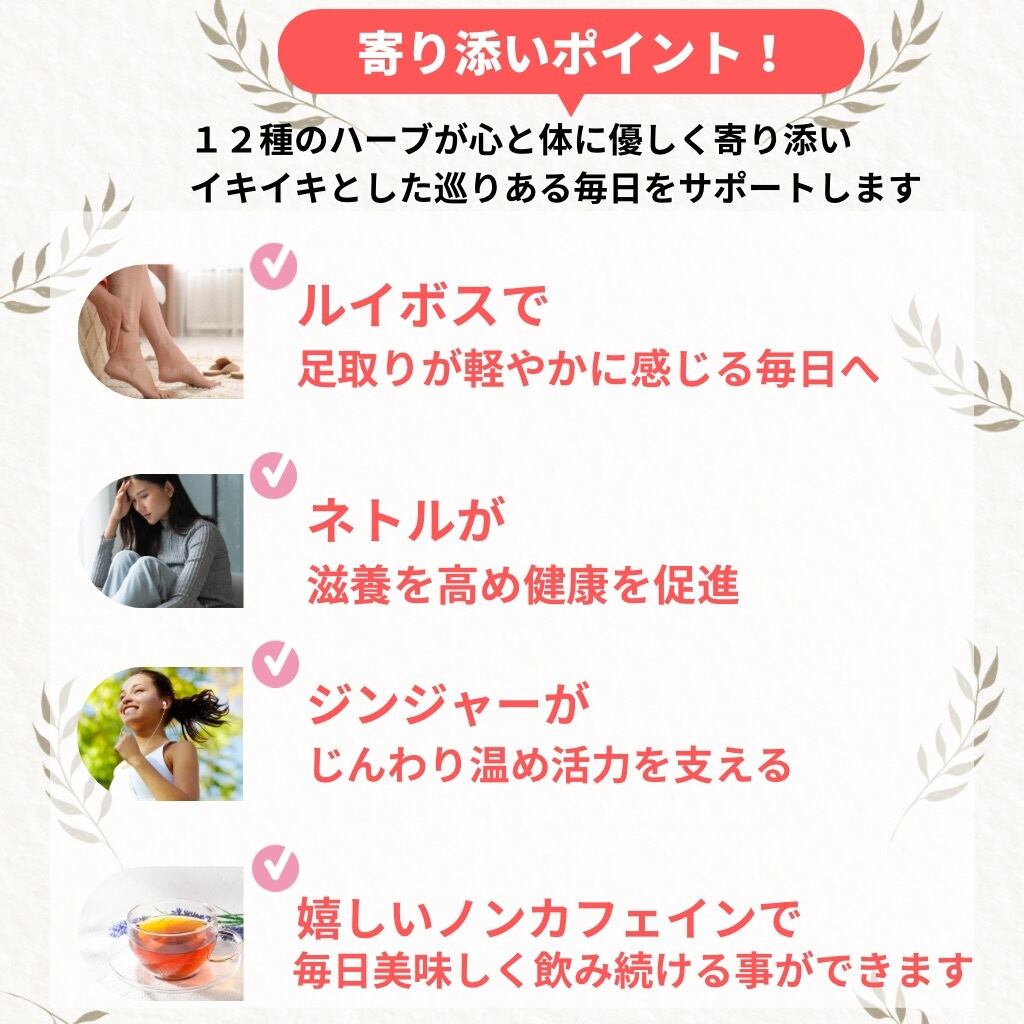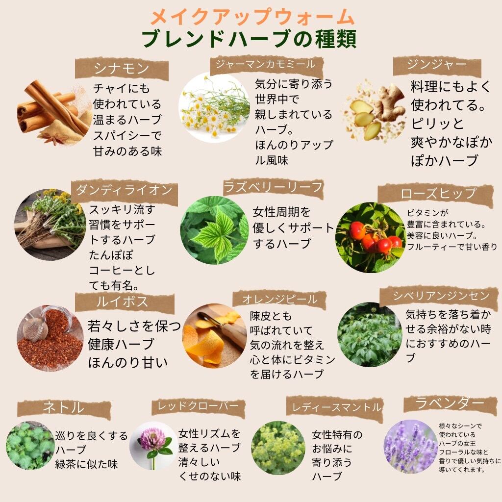 ルイボス、シナモン、ジャーマンカモミール、ローズヒップ、ラズベリーリーフ、ジンジャー、セージ、レモンバーム、オレンジピール、ネトル、レディースマントル