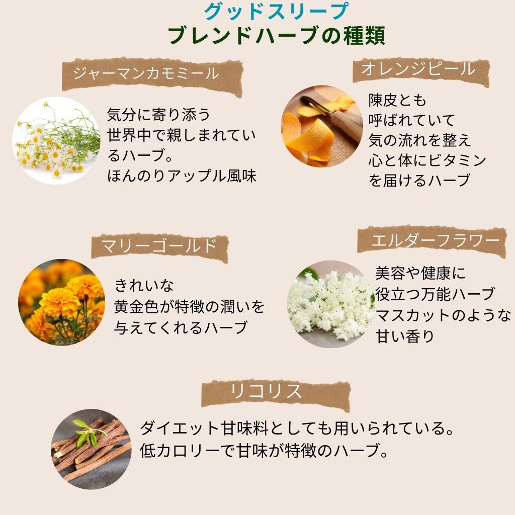 オレンジピール、ジャーマンカモミール、エルダーフラワー、リコリス、マリーゴールド