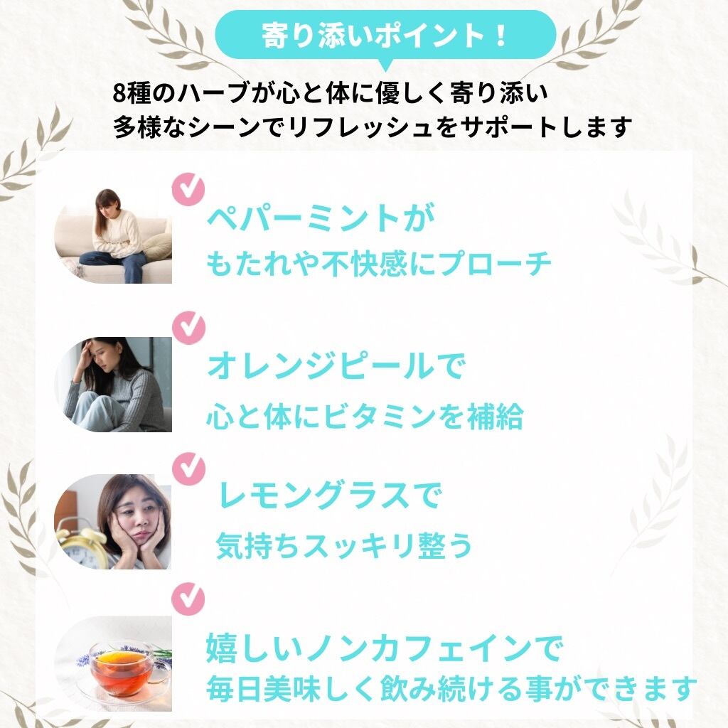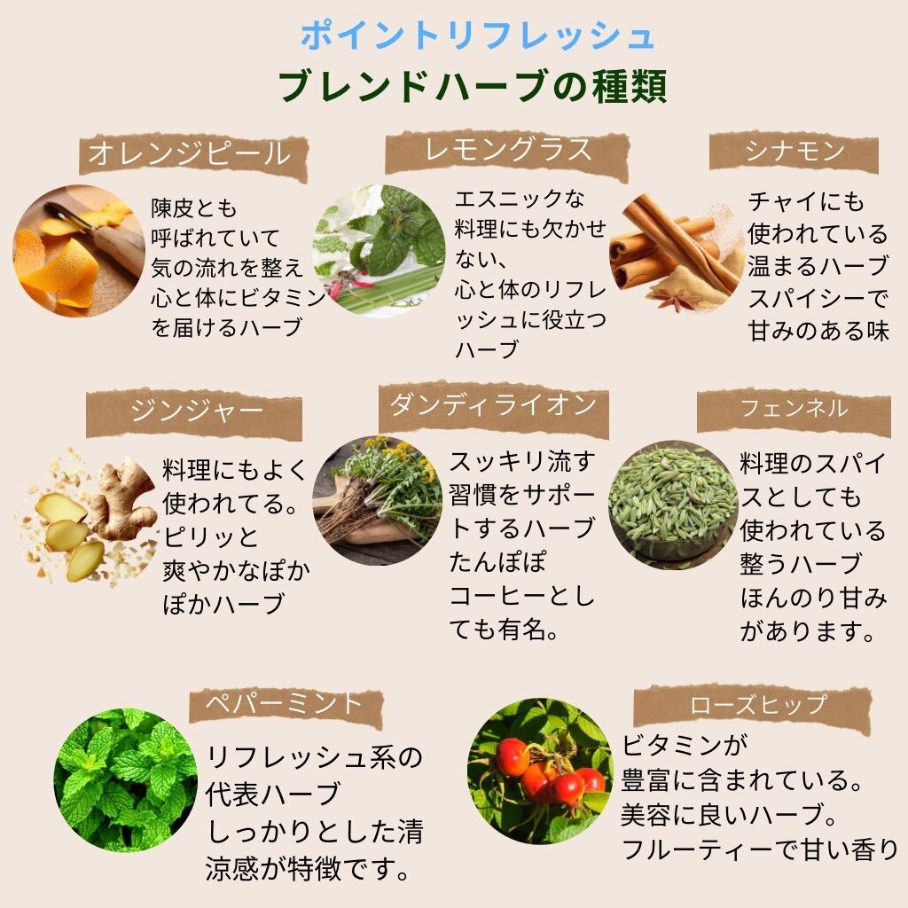 リフレッシュサポート ハーブティー (スッキリしたい時や気分転換に, ポイントリフレッシュブレンド) 8種のハーブ 無添加 ノンカフェイン 農薬不使用 フィトセラピー(植物療法) 朝 昼 晩 食後 毎日飲みたくなる美味しさ 【2weekセット】 ティーバッグ (2g,15包)