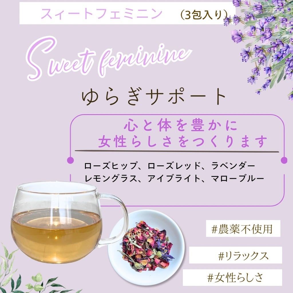 女性のゆらぎサポート ハーブティー (心と体を豊かにする女性らしさをつくる, スウィートフェミニンブレンド) 6種のハーブ 無添加 ノンカフェイン 農薬不使用 フィトセラピー(植物療法) 朝 昼 夜 毎日飲みたくなる美味しさ 【3daysセット】 ティーバッグ (2g,3包)