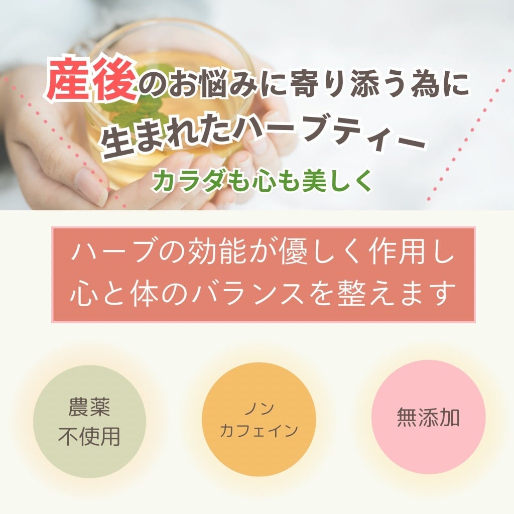 無添加のハーブティーは、厳選された9種のハーブを使用し、飲みやすさと旨味を追求した特別なブレンドです。ママの気分をリフレッシュし、心と体を優しくサポートします。母乳量や栄養価を増やすための効果も期待できるハーブが含まれております。