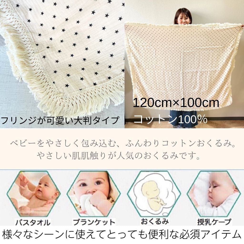 【スター柄の4重ガーゼスワドル】 コットン100%の4重ガーゼ仕様でベビーをやさしく包み込むふんわりスワドル。お昼寝用、おでかけ用として車やベビーカーでもお使いいただけます